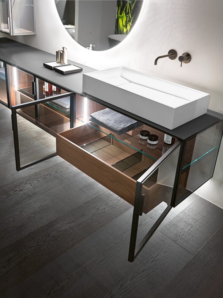 If you are seeking the ultimate luxury bathroom furniture then you must consider our Air collection from our Italian brand Casabath. This range of bathroom furniture features an aluminium frame work combined with glass panels and elegant wood interiors. The result is light elegant and timeless bathroom design. Choose from storage units with integrated wash basins, mirror cabinets, shower enclosures and lighting solutions to create the perfect space. The XS colour range in fifty-five open pore lacquer finishes can complement any colour scheme you might have in mind.