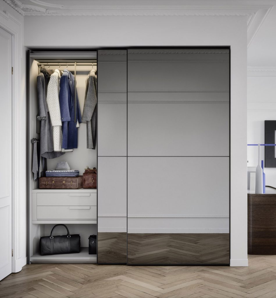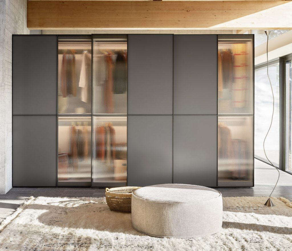 Layer wardrobe with doors in reeded glass and grey lacquer