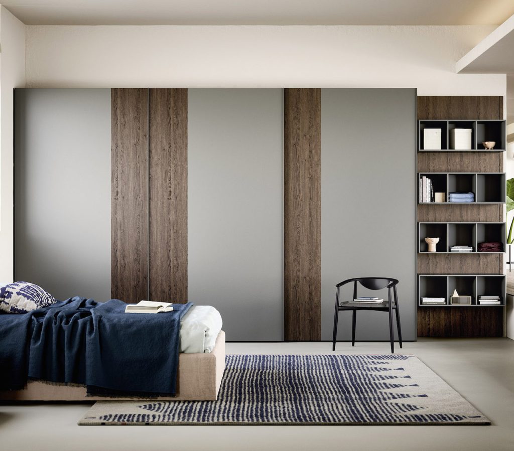 Offset wardrobe with walnut and grey panel doors